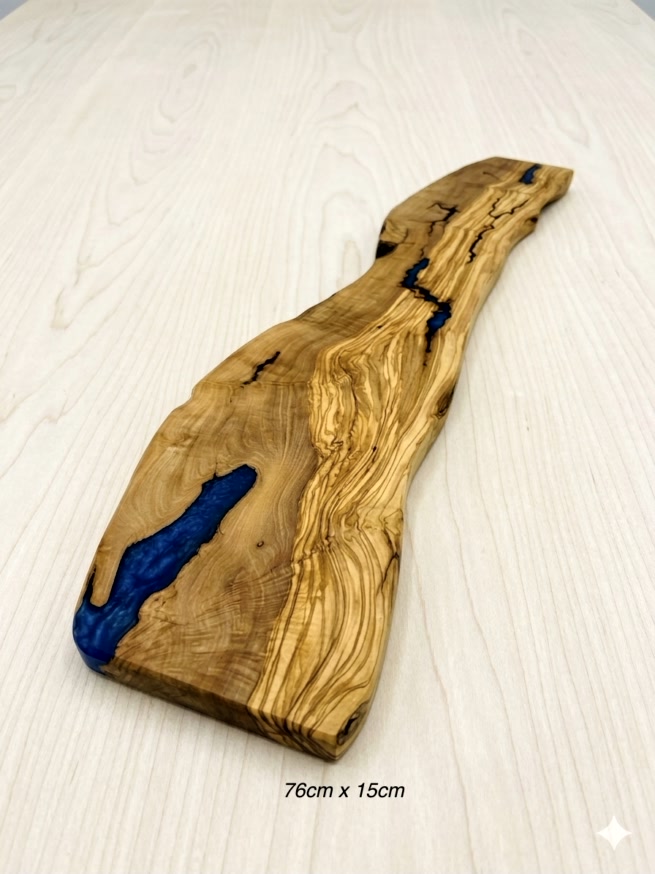 Live edge olive wood charcuterie board with deep blue sea resin inlay