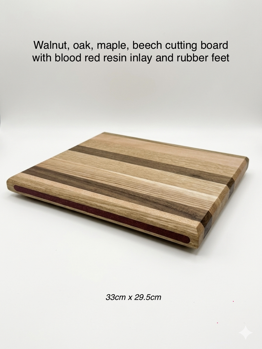 Walnut, Oak, Maple, Beech cutting board with blood red resin side inlay and rubber feet