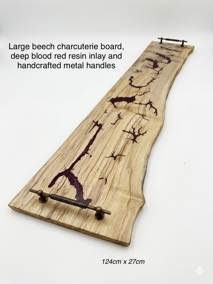 Large beech charcuterie board with deep bllod red resin inlay and handcrafted handles