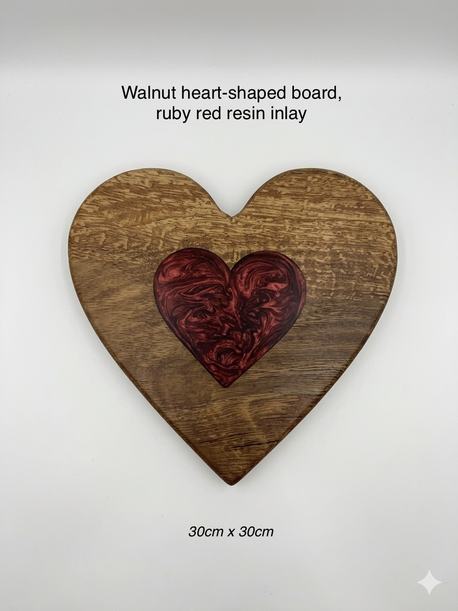 Walnut heart shaped board with ruby red resin inlay